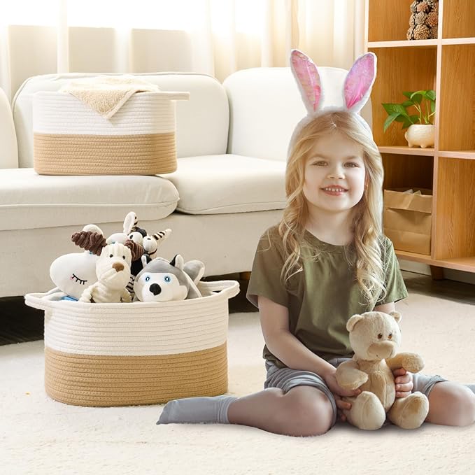 - 【Applicable】The woven basket can store children's products, such as children's toys, baby diapers, baby clothes, baby laundry basket,snacks, books, blankets, towels, and other baby products.It is the perfect storage basket for living rooms, bedrooms, bathrooms, baby rooms, miscellaneous rooms, playrooms, daycare centers, classrooms,warehouses, and storage rooms.The rope basket can also be used as a basket for home storage, organizing clothes and shelves, making your room cleaner and tidier.