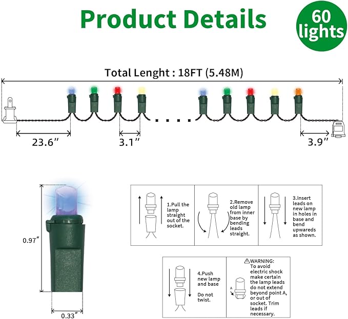 • 5mm LED Christmas Lights: 60 counts Multicolor 5mm wide angle stable LED string lights spaced 3.1 inches apart with green wire. 23.6 inch leads have a stackable male plug and 3.9 inch tails have a female plug for easy end to end connection.