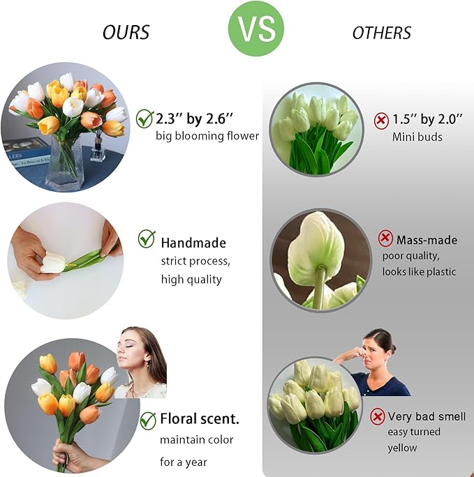 • Real Touch:Made from special PU material,providing a moist touch just like real flowers,they are soft and easy to bend or cut.