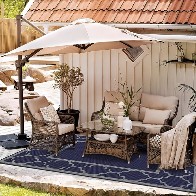 - Mood-Boosting Colors:Choose stain-resistant dark tones or go modern with blue & white or black. The reversible mat, with outdoor carpet qualities, is easy to clean and coordinates seamlessly with various decors. Whether placed on your deck or under a shaded umbrella, it serves as the perfect outdoor patio rug to match the style of your pamapic outdoor furniture.Itâs an excellent piece for fall home decor or to use as a stylish outdoor rug fall accent