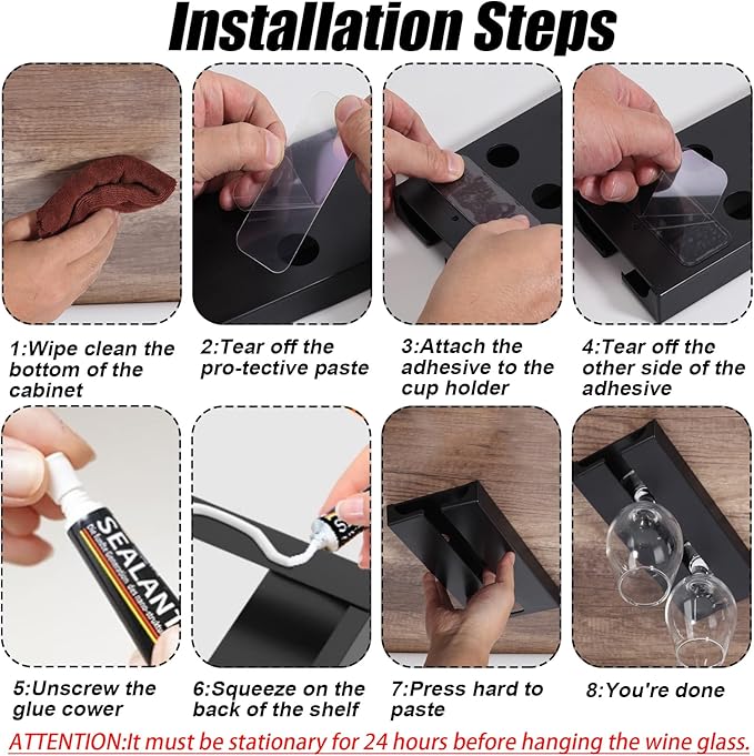 • 3. EASY TO INSTALL: The wine glass rack is equipped with self-adhesive adhesive, Punch-free,easy to install,Due to the different materials of cabinets, Suitable for different installation environments:bar glass holder,wine cabinet,kitchen cabinet,under shelf in receiption room etc.