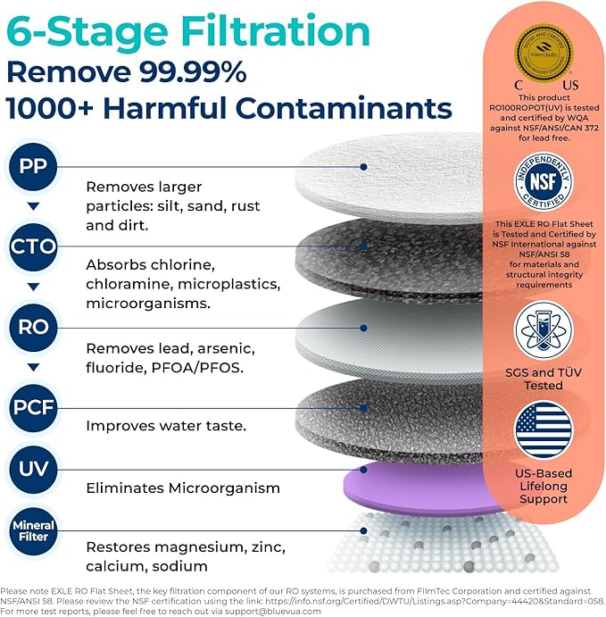 - 6-STAGE ADVANCED FILTRATION WITH UV LIGHT: The Bluevua RO100ROPOT-UV boasts a superior 6-stage filtration system, featuring a 0.0001Ξm RO membrane, including UV light and an added remineralization filter. Certified by WQA against NSF/ANSI/CAN 372 for lead-free and tested by SGS, this combination effectively reduces TDS, PFOA, PFOS, Chlorine, Fluoride, Arsenic, Lead, and more, while also enriching water with essential minerals, balancing taste and health benefits.