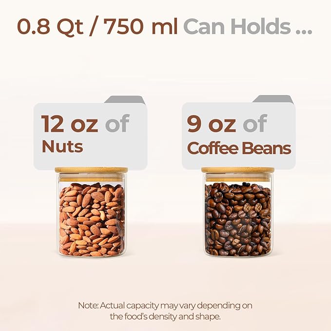 - Versatile Glass Canisters: our 0.8Qt glass pantry storage containers ideal for storing cereals, cookie, snacks, nuts, oat, or even can use glass jars as meal prep jars, salad jars, candy jar, bath salt jars, spice jars, sugar coffee containers