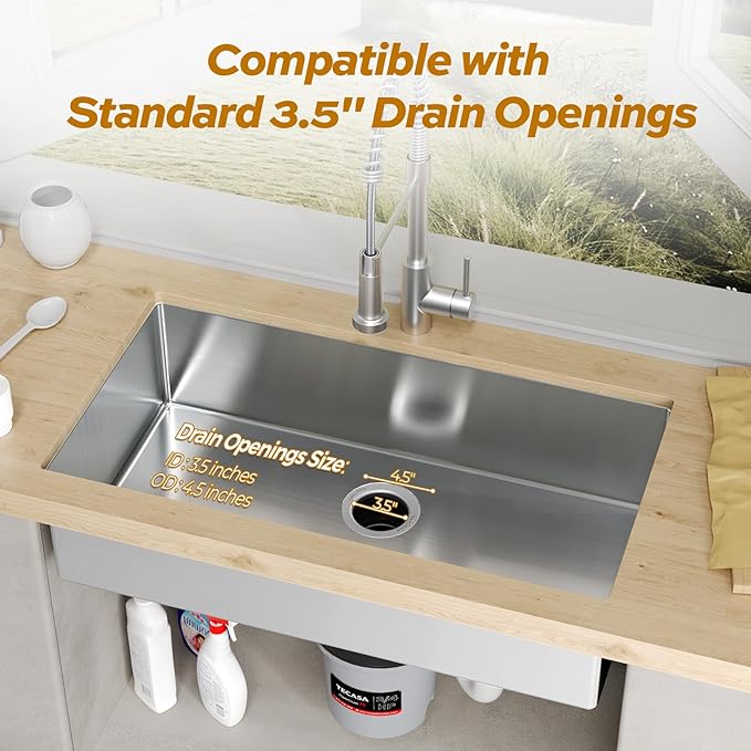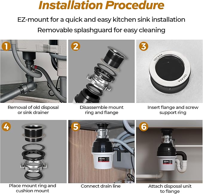 - ðððððð ðððððððððððð: The sink disposal features an exquisite exterior design that fits most existing EZ mounting assemblies, making it easy and fast to install or replace. It's compatible with other popular brands. TECASA garbage disposal is suitable for most home kitchens for standard 3-1/2 inch sink opening hole. A pre-installed 39" power cord for electricity connection.