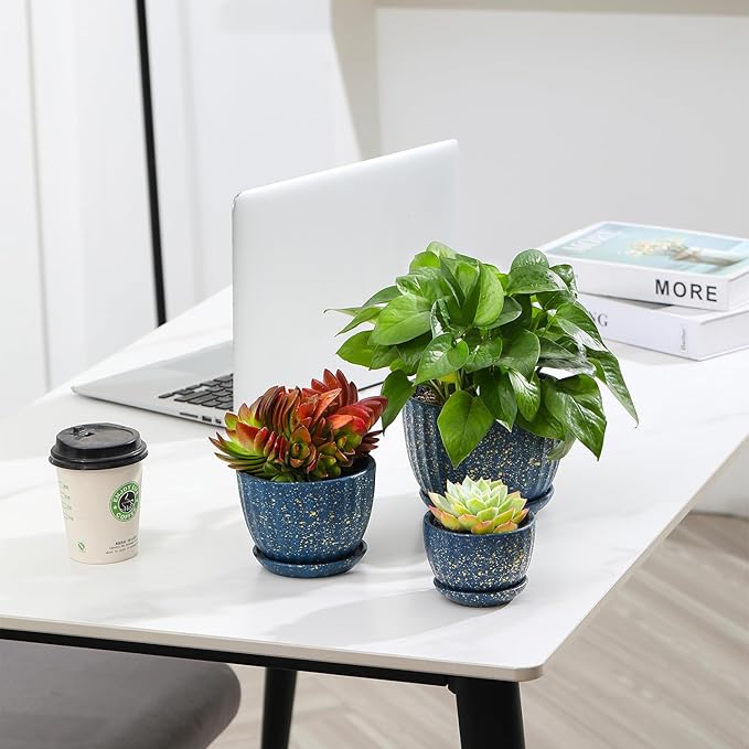 • SMALL PLANTER SET: These garden plant pots are made of ceramic and come in three sizes: Medium width is 5.5 inches (14 cm), Small width is 4.3 (11 cm) inches, and nimi width is 3.3 inches (9 cm). They are fired at high temperature, so they are durable and lightweight..