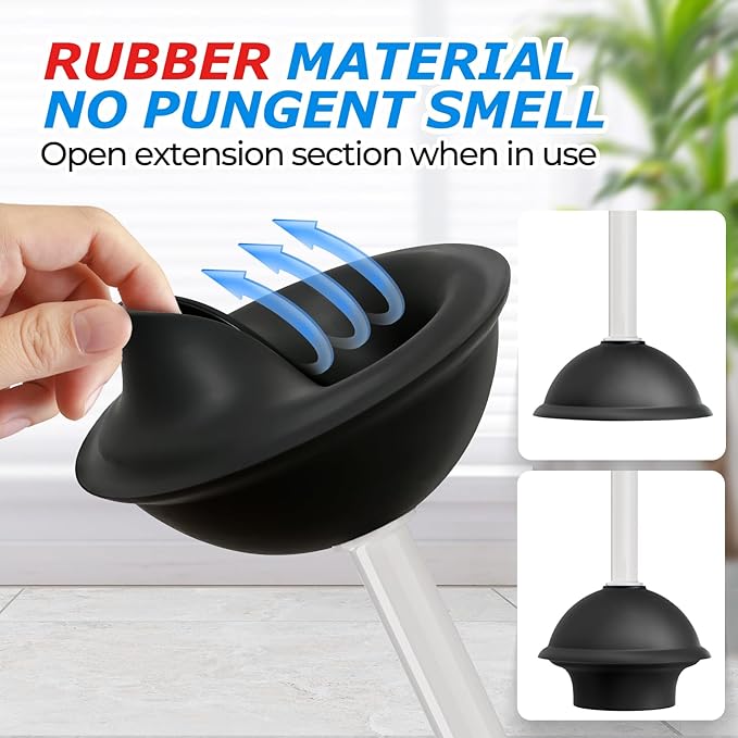 • Extended handle -Heavy Duty Toilet Plunger: Compared to ordinary handles, our upgraded extended handle provides a better user experience and prevents stains from splashing onto the hands.A professional powerful suction cup that can solve various blockage problems. Comfortable handles provide greater support during use.