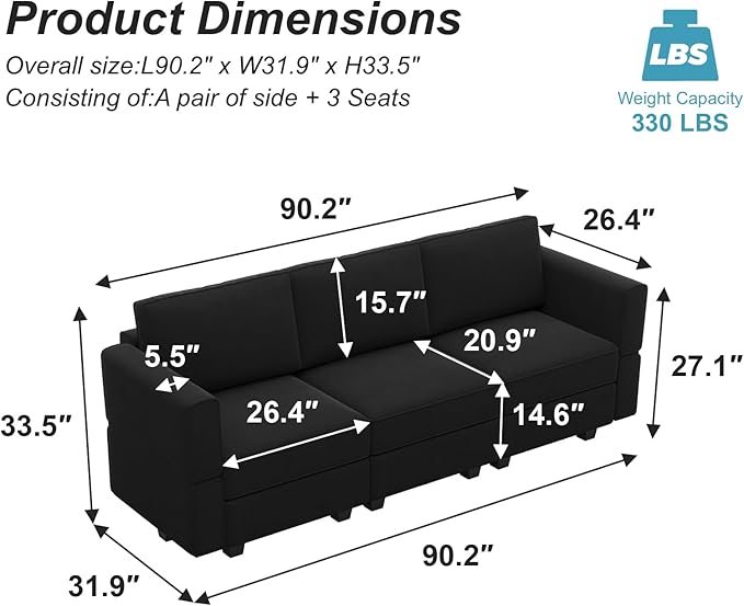 - Easy to Assemble: The dimension of 3 seater sofa is 90.20''(L)*31.90''(W)"*33.50"(H). The sofa couch comes in 4 boxes that may arrive separately within different days. No special tools needed, just follow a few steps in the assembly instructions.
