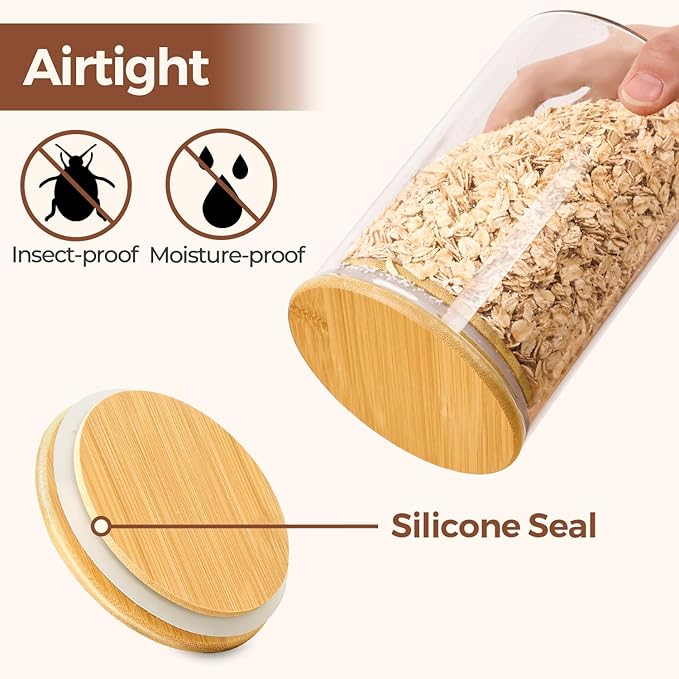 • Versatile Glass Canisters: Experience the versatility of 6 pieces glass food containers; ideal for storing cereals, cookie, snacks, nuts, oat, or even can use these glass jars as candy jar, bath salt jar, spice jar, sugar coffee containers