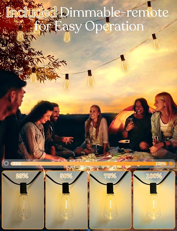 50 FT Outdoor String Lights - LED Waterproof Patio Lights with Dimmer Remote - Edison Bulbs for Porch, Backyard & Cafe/Bistro