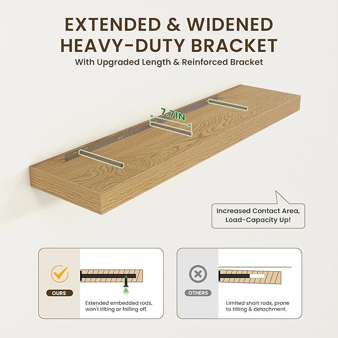 - DEEPER & THICKER SHELF- Our floating shelves measure 55W x 11.6D x 2H, deeper and thicker than usual wall shelves, which create more storage and display space for your home
