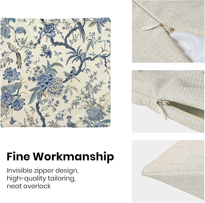 - 【Spring Pillow Covers】 Our Chinoiserie floral throw pillow covers 16x16 inch are made of excellent breathable polyester cotton fabric. The blue and white floral decorative pillow covers is durable, soft and skin-friendly. The plant outdoor pillow covers adopt exquisite edging technology and four sides of our floral pillow covers are sewn firmly, which is not easy to open the line.