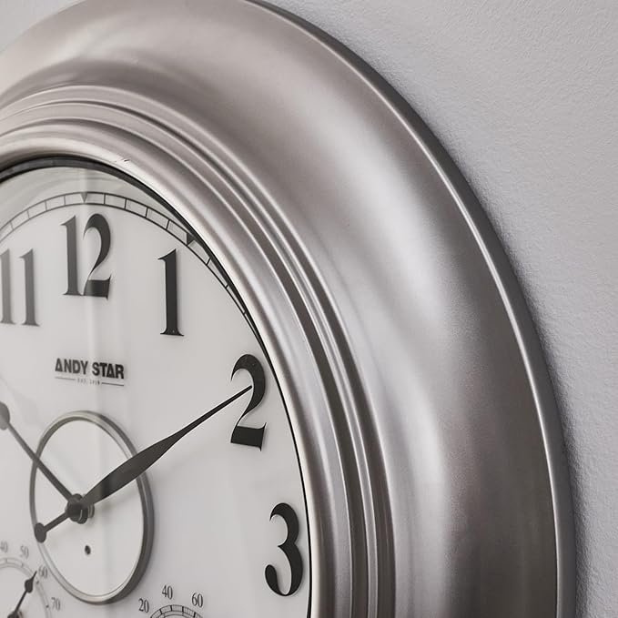 Andy Star 21 Inch Silver Illuminated Outdoor Wall Clock Waterproof with Thermometer and Hygrometer, Oversized Battery Operated Round Wall Clock, Big Silent Non Ticking Clock for Patio Pool Garden