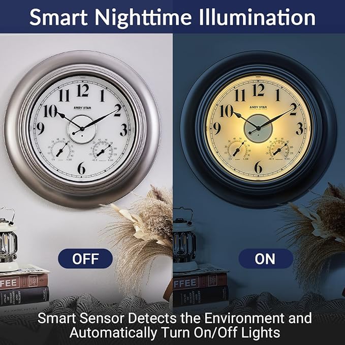 - Smart Light Sensor Technology: This 21 inch outdoor clock with temperature automatically illuminates with a warm backlight in the dark. It's easy to read from afar even then; The smart sensor lights up a warm glow at night and turns off in daylight;Select from Always On, Off, or 4 - hour timer backlight modes