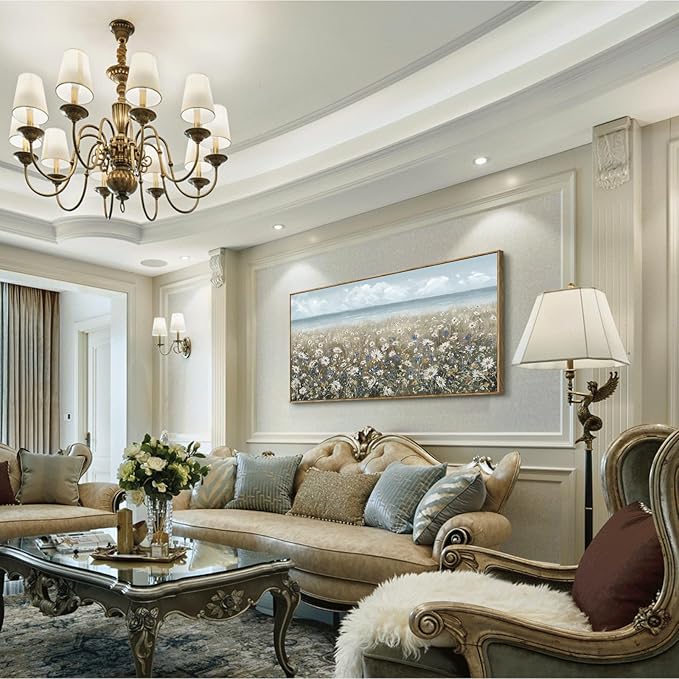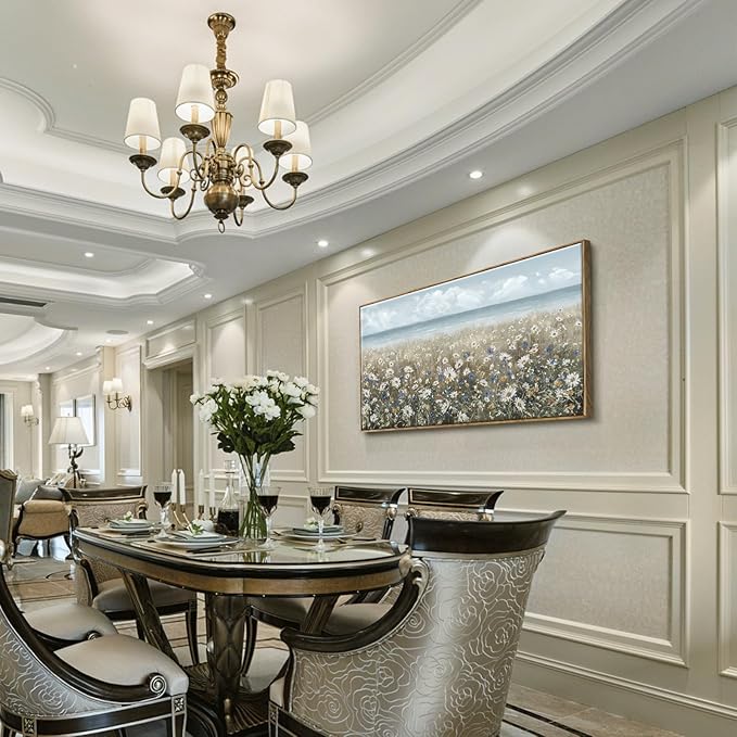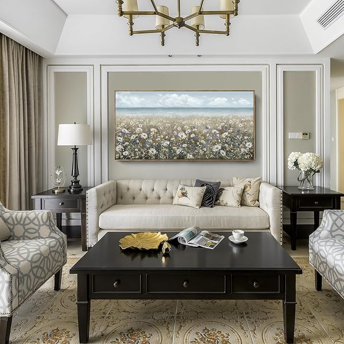 - β€Bring a Beach Vibe to Your Space: This large floral wall art depicts a seashore covered with newly blooming wildflowers Daisy. The upper half of the canvas wall art features a blue sky and a calm ocean in pale blue and gray tones for a fresh and breezy look. The lower half of the artwork is covered in a neutral palette of white, cream, and brown to complete this coastal farmhouse piece.