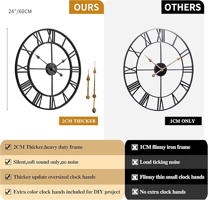 - [Easy to Read and Hang]-This large 24 Inch wall clock is simple to hang based on included round keyhole style installation on the center back;Package Comes with 1 set extra antique gold color Clock Hands+ non-traceable plastic hook , select your favorite fresh look & enjoy your DIY time