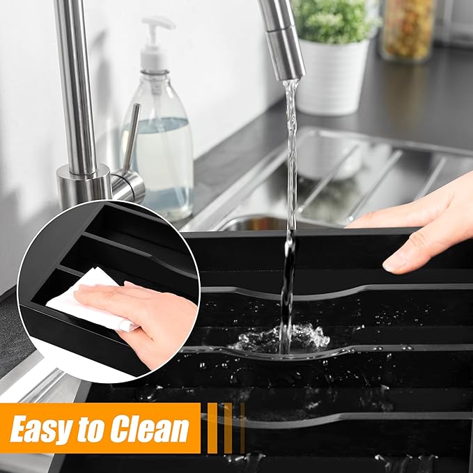 - ✅【Deep Compartments & Reinforced Base】Our utensil drawer organizer features compartments with a depth of 1.9 inches, helping maximize drawer space and perfect for storing more essential tools and gadgets. The utensil silverware drawer organizer flatware cutlery tray comes with a reinforced base, ensuring durability for long-term use, and is ideal for supporting the weight of heavy-duty utensils and knives. Keep everything you need conveniently at hand while cooking, neatly visible, and easy to grasp when preparing the next meal in the kitchen.