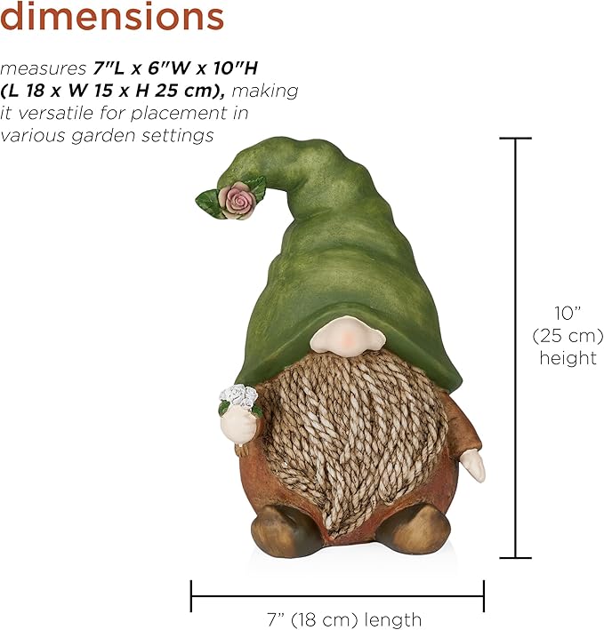 • IDEAL DIMENSIONS: With measurements of 7"L x 6"W x 10"H, this gnome statuary is a compact yet eye-catching feature for your outdoor space