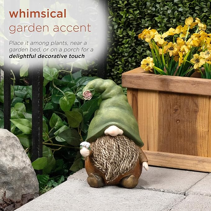 • CUTE GARDEN DECOR: This sweet gnome is topped with a green hat and holds a cute flower, showcasing nature-inspired charm