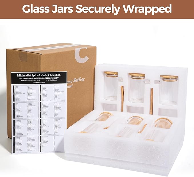 - Comprehensive Package: You'll receive a set of 12 spice jars with bamboo lids and spoons, each boasting a capacity of 8 fl.oz and measuring 4 x 2.5 inches. But that's not all â we've also included oil and water-proof labels, along with 184 pre-printed spice label stickers, 16 writable pantry labels, and 75 expiry date labels.