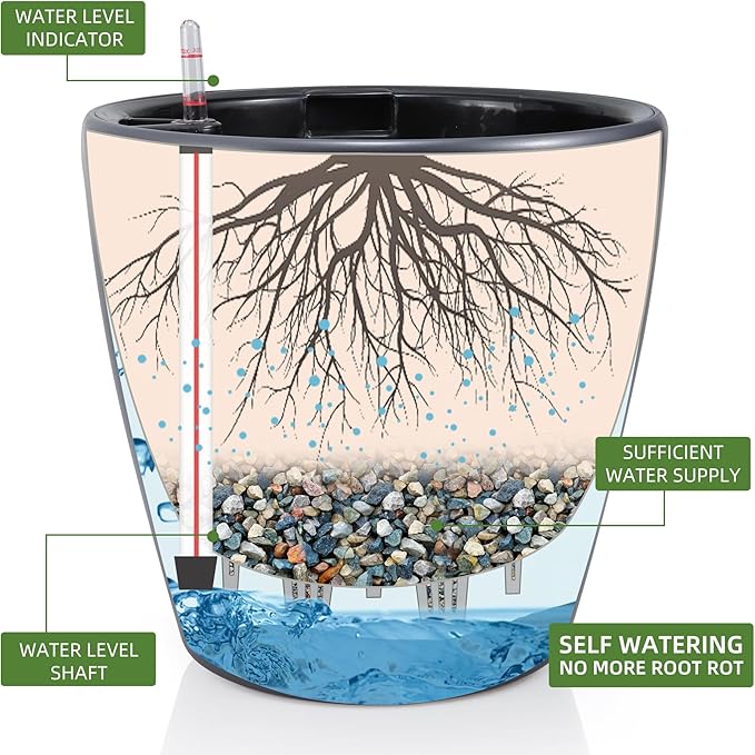 - SELF WATERING & NO MORE ROOT ROT - The smart unique sub-irrigation system is one of the most appealing aspects among all Dexceder planters. The easy-to-use separated integrated water reservoir or catcher- keeps your soil well aerated and automatic supplies plants with the right amount of ongoing moist air & nutrition for optimal growth. The insert indicator shows you the exact time to water again. The full water supply period can single-handedly last over 3 weeks based on different live plants