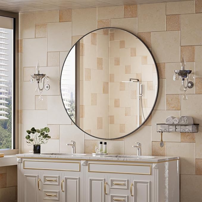 • Modern Brushed Frame Design: 42-inch black circle mirror is crafted of an aluminum alloy metal sleek frame, making it ideal for bathroom mirror, entrance mirror, vanity mirror, living room mirror