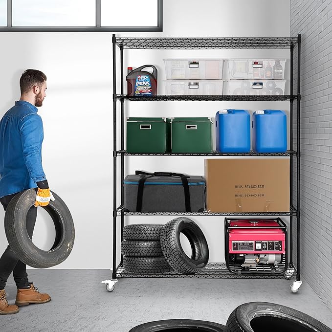 5 Tier Wire Shelf Shelving Unit, 60"x 24"x82" Metal Storage Shelves, Heavy Duty Garage Storage Shelves with Wheels, Chrome 3000LBS Capacity Wire Shelf Rack for Restaurant, Garage, Pantry, Kitchen