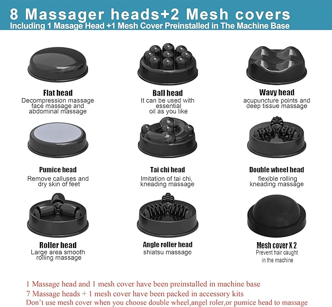 - ☑️【Full body massage】: Our cellulite massager comes with 8 interchangeable massage heads (1 in the machine base and 7 in the accessory bag)plus 2 mesh covers, allowing you to target various body areas, including the stomach, belly, abdomen, thighs, arms, legs, neck, back, shoulders, waist and buttocks, with ease.