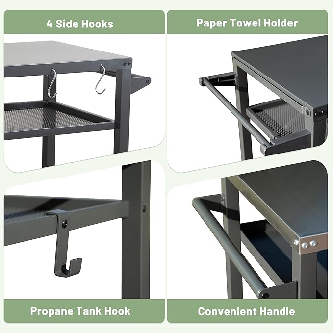 - Full & Useful Accessories- The food prep cart table includes paper towel holder, paper tissue holder, propane tank hook, bottle opener, 4 multi-functional tool hooks, etc, organizing all your favourite utensils for different cooking propose.