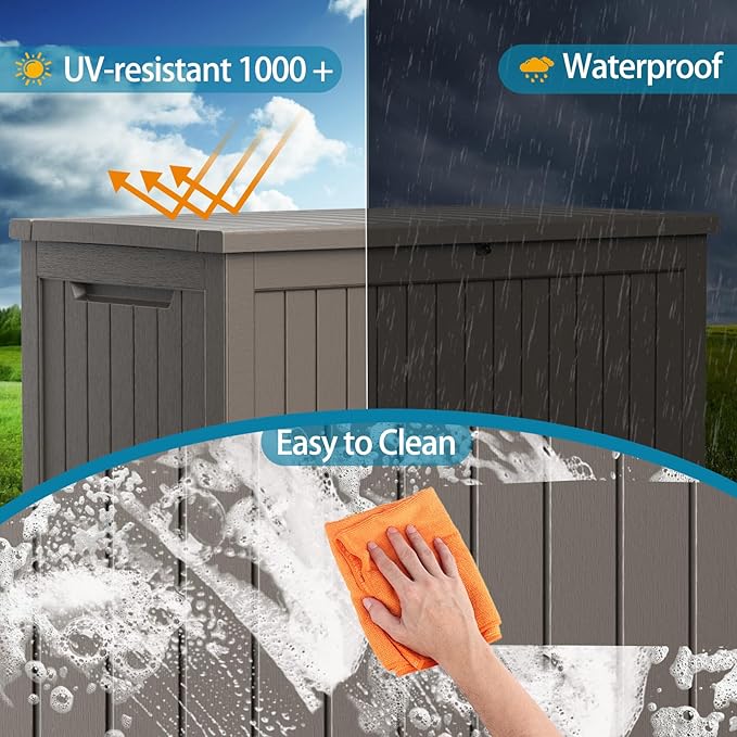 - Safety design: Each deck box has lockable holes (not included) for added security; in addition, the box is equipped with a hydraulic stand, which allows easy opening and slow closing and prevents hand pinching. The outdoor waterproof deck box has built-in handles on both sides, ensuring easy grabbing and moving.