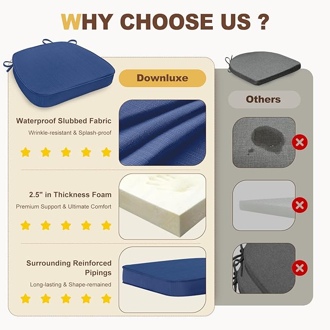 downluxe Chair Cushions for Dining Chairs, Waterproof Kitchen Chair Pads, Non-Slip Dining Seat Cushion with Ties, 17" x 16" x 2.5", Blue, 6 Pack