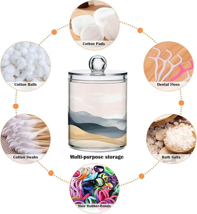 • EASY TO USE - As excellent bathroom accessories, you can easily open this storage canister with one hand. You can use these storage containers for organizing small items and keeping them neat and clean. Such as cotton balls, cotton swabs, cotton pads, beauty eggs, face brushes, floss picks, hair ties, bath salt, pens, clips, and more