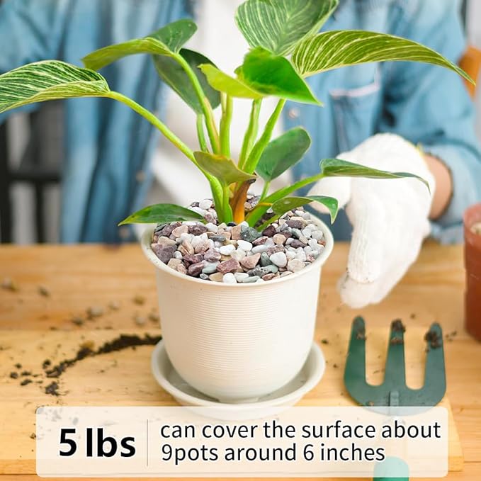 • 【Pebbles Size】These stones are packaged in a 5 pounds bag. The size is about 1/5 inch, it is perfect for succulent and cactus, as well as any vase or terrarium. The first picture shows the product in two states: dry and wet, and the pebbles color is more vibrant in the wet state