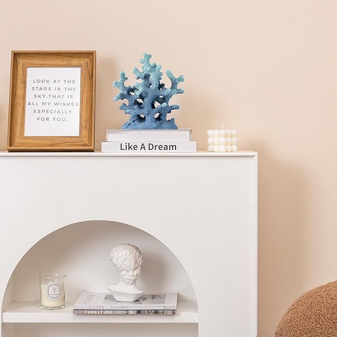 7.1" H Blue Coral Decor, Resin Coral Statue, Nautical Decorations for Home, Bedroom, Bathroom, Living Room, Beach/Coastal/Ocean Themed Cabinet Shelf Tabletop Decor