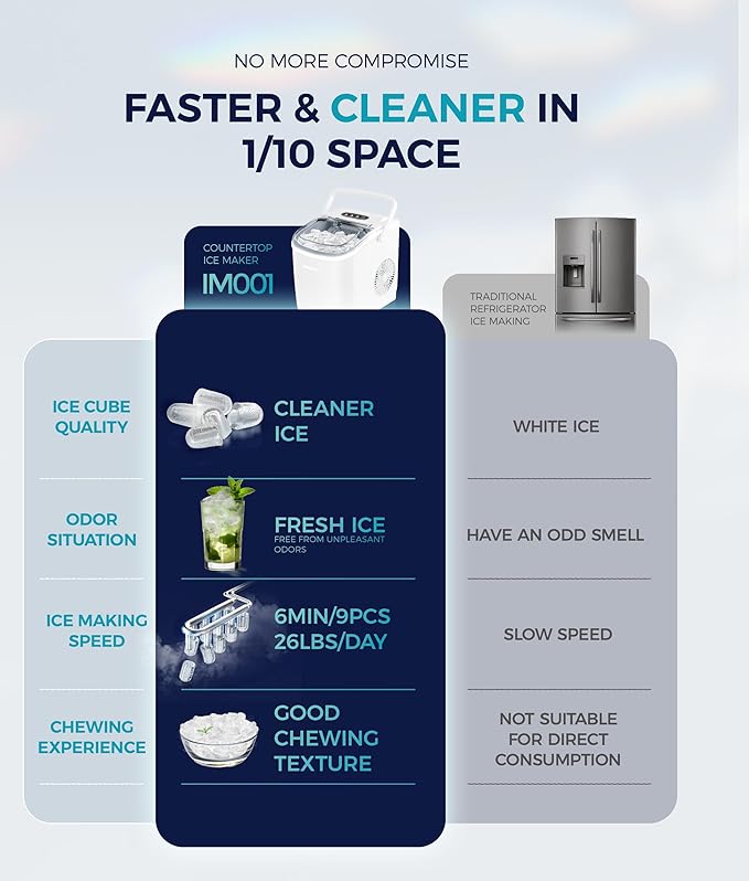 - 6 Mins Ice-Making & Ultra Quieter: Our Euhomy ice maker only takes 6mins that will enjoy the first batch of fresh bullet ice. With a 1.2L water tank and powerful compressor, the portable ice maker easily makes maximum ice capacity to 26lbs ice per day and holds up to 1.3lbs ice at a time. Also, our ice maker is not only excellent in refrigeration, but also at less than 45db normal noise, ensuring a comfortable and quiet environment to enjoy ice-making, similar to a working freezer