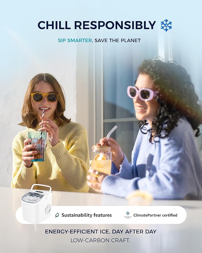 - Portable Design & Bullet Ice: Our ice maker comes with a sturdy handle, weighs only 13.89lbs and with compact size 11.57(L)x11.42(W)x8.74(H)in. Those features make ice maker easy to carry and perform well on any occasions like Kitchen/Home/Camping/RV/Party/Dorm. Also, the newly designed countertop ice maker produce the most popular bullet-shaped smooth ice cubes, which won't stick together easily or hurt your hands or mouth even are excellent for cold drinks, iced coffee or chew as snacks