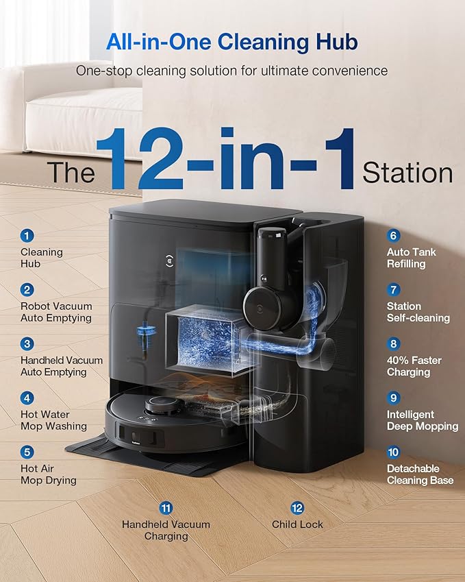 - All-in-One Cleaning Hub - This space-saving design features a bidirectional dust collection system, allowing both vacuums to auto-empty their dustbins into the station's large capacity bag. Plus, it also supports 158â hot-water mop washing, hot-air drying and auto water refilling. Ready to tackle any cleaning task, save you time and effort.