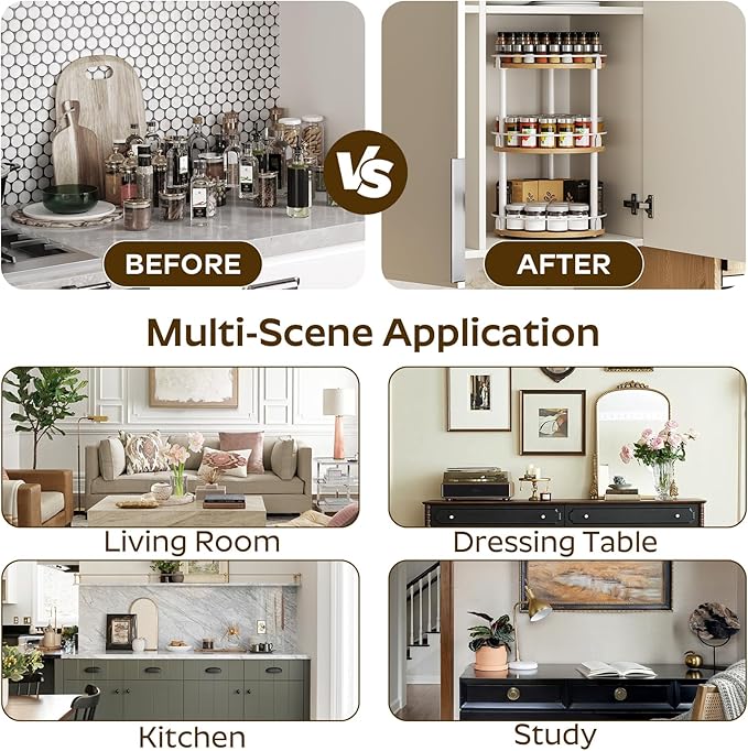 • Reduce Countertop Pressure: It is multifunctional. On the kitchen countertop, it keeps spice jars close at hand to make cooking fun. On the vanity table, it holds your beloved pieces. At the dinner table, you can easily "spin" to get your favorite