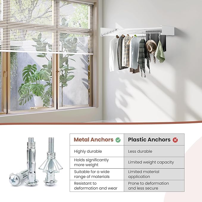 • Foldable Space-Saver – Sleek wall-mounted drying rack folds flat against the wall when not in use, freeing up floor space in laundry rooms, patios, or balconies.