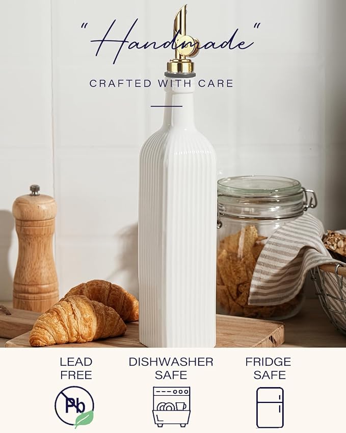 • [Elegant Design] A sleek white ceramic cooking oil dispenser with embossed stripes, creating a visually appealing and tactile experience for your kitchen or dining table