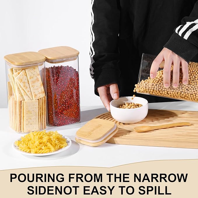 - Safe to use : The glass food storage jars with bamboo lid containers is made of 2.5mm food-grade high borosilicate glass, more thicker and durable than other glass canister set, can be stackable when necessary for space saving storage or lined up in your kitchen or pantry, meeting all your storage needs and avoid the further cabinet clutter and 100% lead-free.