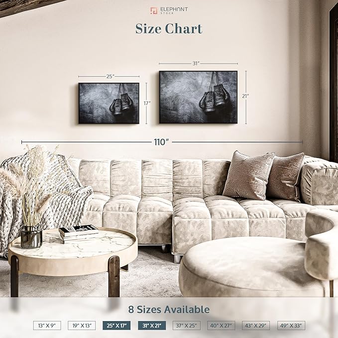 ElephantStock Boxing Gloves Wall Art - Horizontal Framed Canvas - 1-Piece Living Room Wall Decor - Photography Sports Canvas Print - Black and Gray Decor for Wall - 31" X 21"