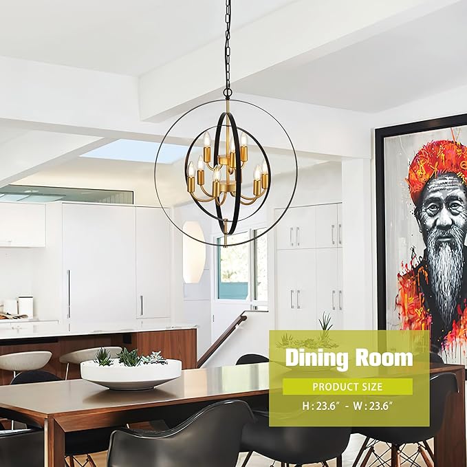 - 【Height Adjustable】This black gold globe chandelier is adaptable for sloped, hanging and flat ceiling. Fixture Dimensions: 23.6" high x 23.6" wide. Equipped with 78.7inch(2m) chain and cord; length can be adjusted according to your preferences and design. Ideal for different areas including the dining room, living room, kitchen, inches.