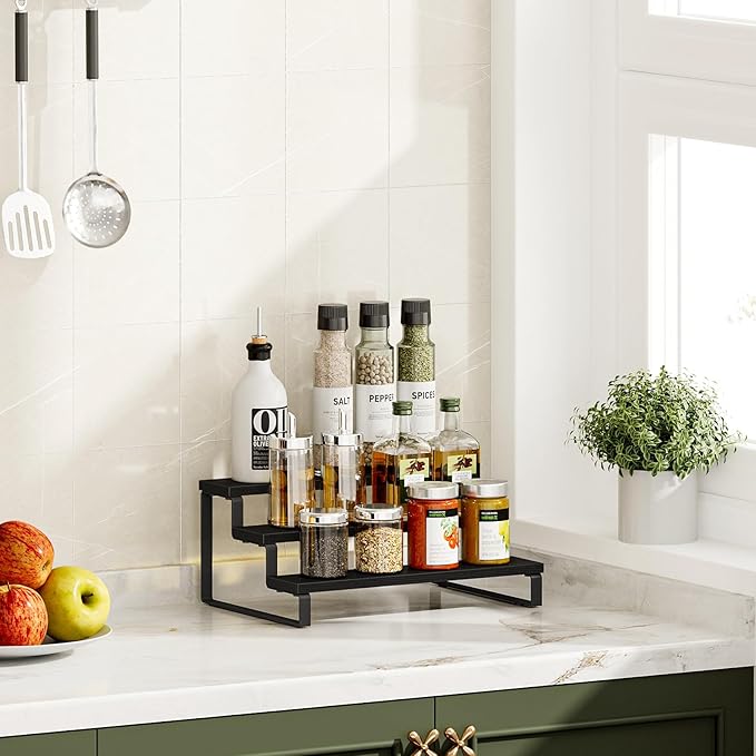 • Easy Access and Visibility: The tiered spice rack design allows for easy access and clear visibility of all your spices, so you can quickly find what you need while cooking. Say goodbye to rummaging through drawers and cupboards.