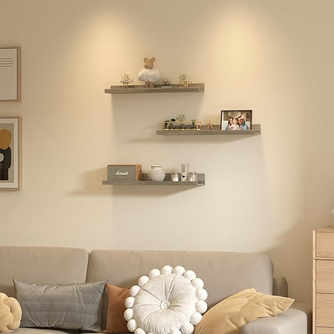 - Beautiful hanging shelves: These gray wall-mounted ledge shelves are both stylish and durable, made of high-quality medium-density fiberboard. The wood grain appearance adds a delicate touch to your room decor, making it more fashionable and modern