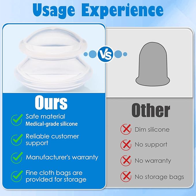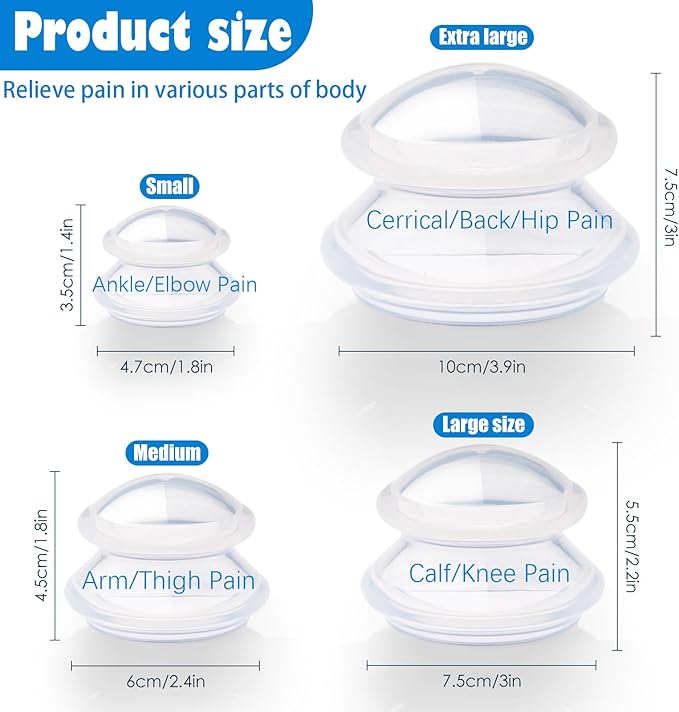 • Include:4 Massage Silicone Cups: Extra Large Cups (3.9”x 3”), Large Cups (3”x2.2”), Medium Cups (2.4”x1.8”), Small Cups (1.8”x1.4”), A delicate flannel bag, Easy to store those cups.