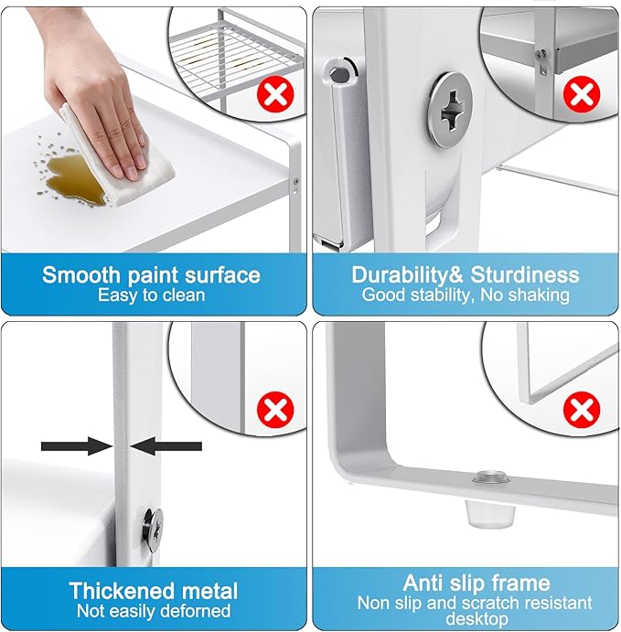 - Easy to Install:Easy to assemble with a clear manual. Comes with accessories and step-by-step instruction, it will be easy for you to install this storage shelves , no drilling needed! We use non-slip suction feet to prevent the countertop organizer from sliding the table.The package includes extension*2 ,lateral leg*2,screw*4,gasket*4 and screwdriver*1