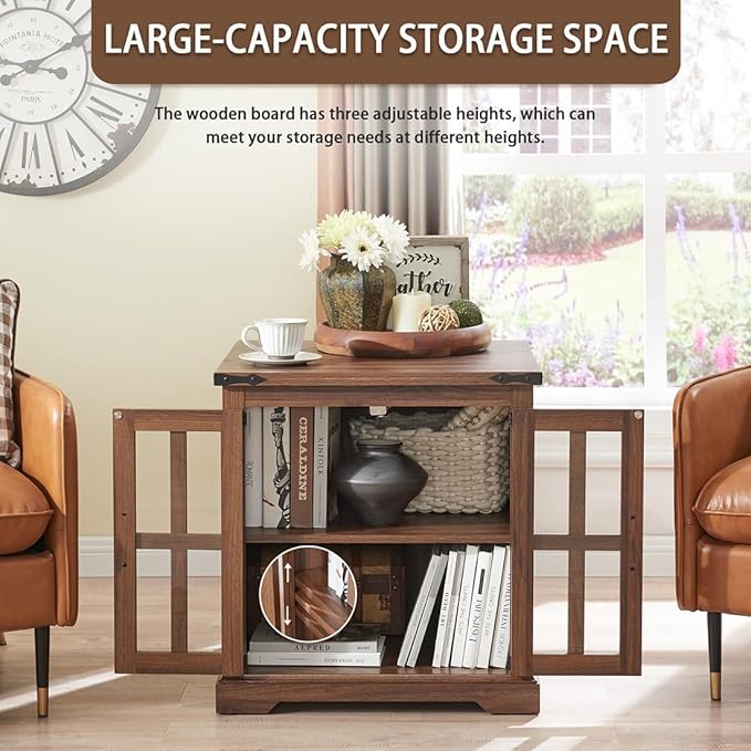 - Eye-catching Farmhouse design : Give your space a dose of country style with this Natural Wood Farmhouse End Table! Youâll love the rustic details of its tempered glass door and barn door design On the side. Its natural wood finish is sure to lighten up your space.