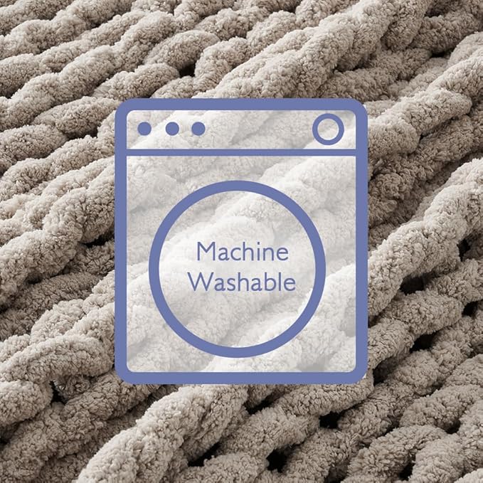 Bigacogo Chunky Knit Throw Blanket for Couch, 80x90 inches, 100% Hand Knitted with Thick Jumbo Chenille Yarn, Cozy Soft Large Rope Knot Cable Crochet Blankets for Sofa Bed Living Room, Taupe