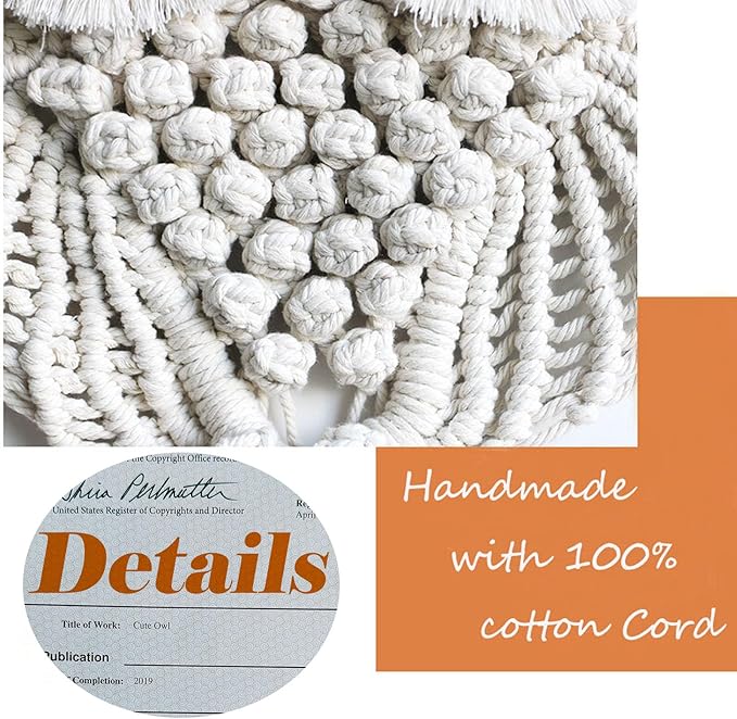 • 【Material & Size】: Our owl macrame wall hangings are made of 100% cotton and hand-made by workers. The size is larger compare with other owls in the market. Beautiful, eco-friendly decorative pendants for indoor use.