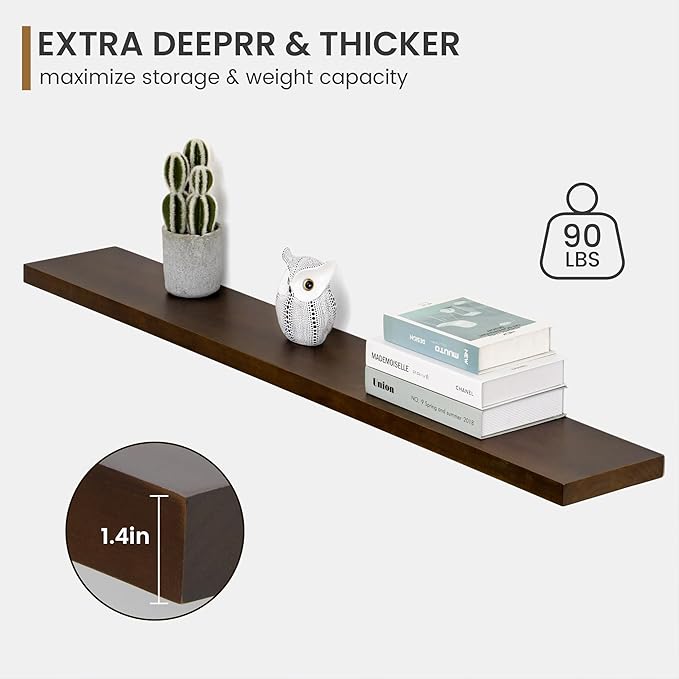 - Extra Deeper & Thicker for Storage - Each board measures 55"W x 8"D x 1.4"H. Extra deeper and thicker design in order to bring maximizes storage space and weight capacity, even hold up to 60 lb. This floating shelf taking up zero square feet, reduces clutter and highlights dÃĐcor in compact spaces. It can help make full use of the empty wall, making it much more space-saving and making your room look larger and tidier.
